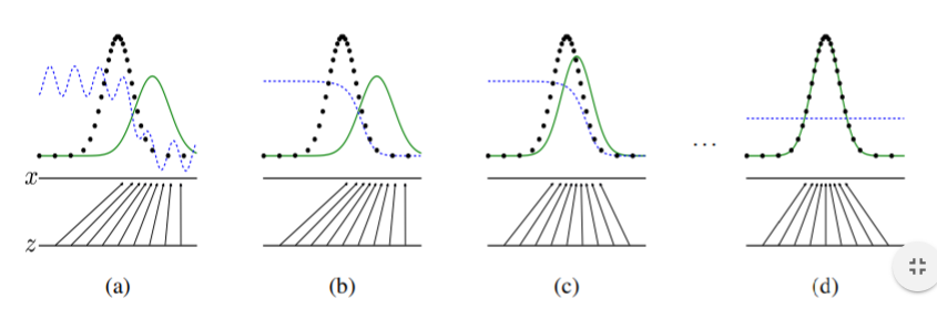 학습이 되지 않은 상태(a)의 generator는 z를 $x_{4}$와 같이 실제 데이터셋에 거의 존재하지 않는 사진으로 만들어냅니다. Discriminator의 피드백을 받으며 점차 generator는 실제 데이터 셋에 존재하는 사진들을 만들어냅니다.