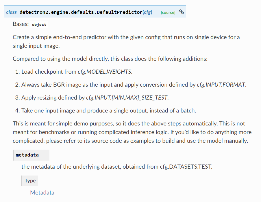 단순히 Inference만을 하고자 할 때는 간단한 end-to-end predictor를 리턴하는 DefaultPredictor wrapper를 사용하면 된다. 모델 로드, 전처리 등 기능을 포함하고 있고, 배치가 아닌 하나의 이미지에 대해 동작한다.