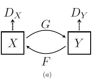 - 위의 그림 (a)와 같이 우리의 모델은 두 개의 매핑 함수 $G : X → Y$와 $F : Y→X$를 포함합니다.