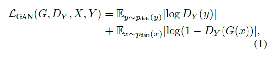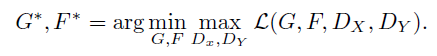 함수 $G : X → Y$와 $D_{Y}$에 대해서는 아래와 같은 목적함수를 적용합니다.