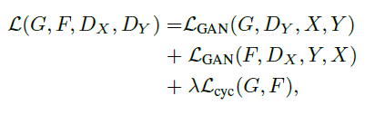 - 우리의 목적함수(objective)는 adversarial losses와 cycle consistency losses, 두 종류의 항으로 구성되어 있습니다.