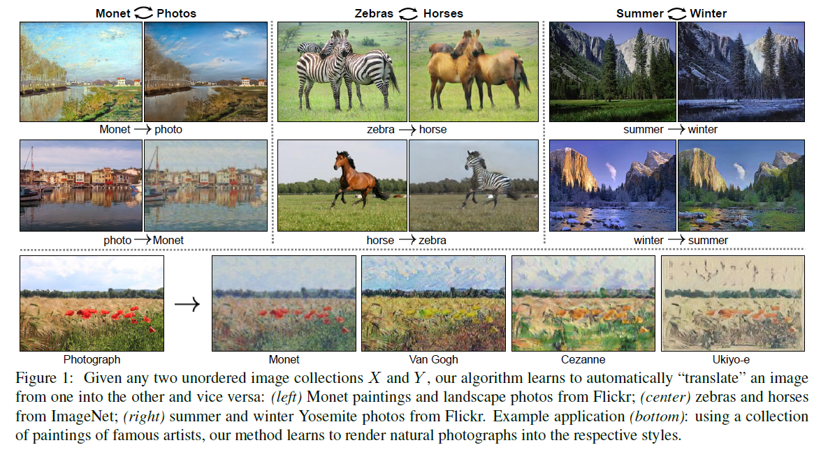 이 논문에서는 짝지어진 학습 예시 없이 같은 것을 할 수 있게 학습하는 방법 (: 이미지의 모음에서 특징을 파악한 후 다른 이미지 모음에 어떻게 이 특징을 적용(translate)할지를 제시합니다. 우리는 도메인들 간(같은 모음의 이미지, ex. 모네의 그림들, 말 그림들..)에는 몇몇의 근본적인 관계가 존재한다고 가정했습니다. 우리는 $\widehat{y}$과 $y$를 구분하도록, 즉 적대적(adversary)으로 학습된 모델을 이용해 이미지$y\in Y$과 구분되지 않는 아웃풋 $\widehat{y} = G(x), x\in X$을 산출하는 $ G : X → Y $를 학습시킵니다. *