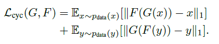 우리는 이러한 행동을 cycle consistency loss를 이용해 유도했습니다. 식은 아래와 같습니다.