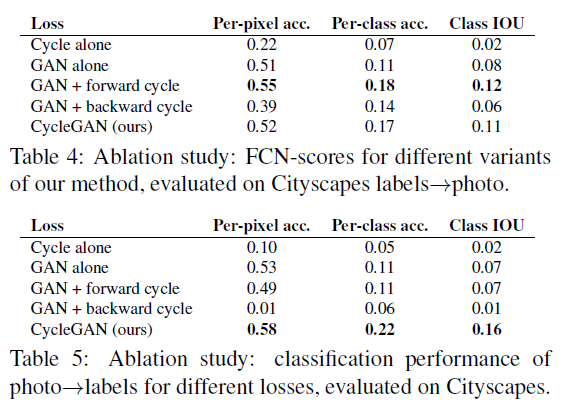 논문에서 최종적으로 채택한 방법인, adversarial loss와 cycle loss를 모두 사용할 때가 성능이 가장 좋았습니다. (사실 그러니까 채택을 했겠죠?)