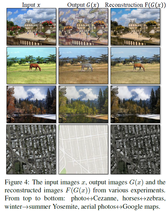 예비 실험에서 우리는 위 식의 L1 norm을 adversarial loss로 대체했었으나 성능 향상을 관찰할 수 없었습니다. Cycle consistency loss가 유도한 결과는 아래 그림에서 볼 수 있습니다.