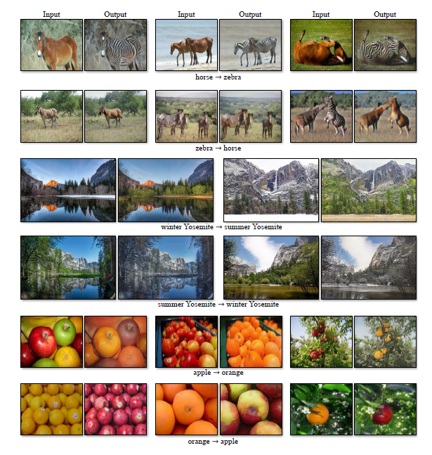 짝진 학습 데이터가 없었음에도 불구하고 collection style transfer, object transfiguration, season transfer, photo enhancement와 같은 태스크에서 퀄리티 높은 결과가 나타났습니다.