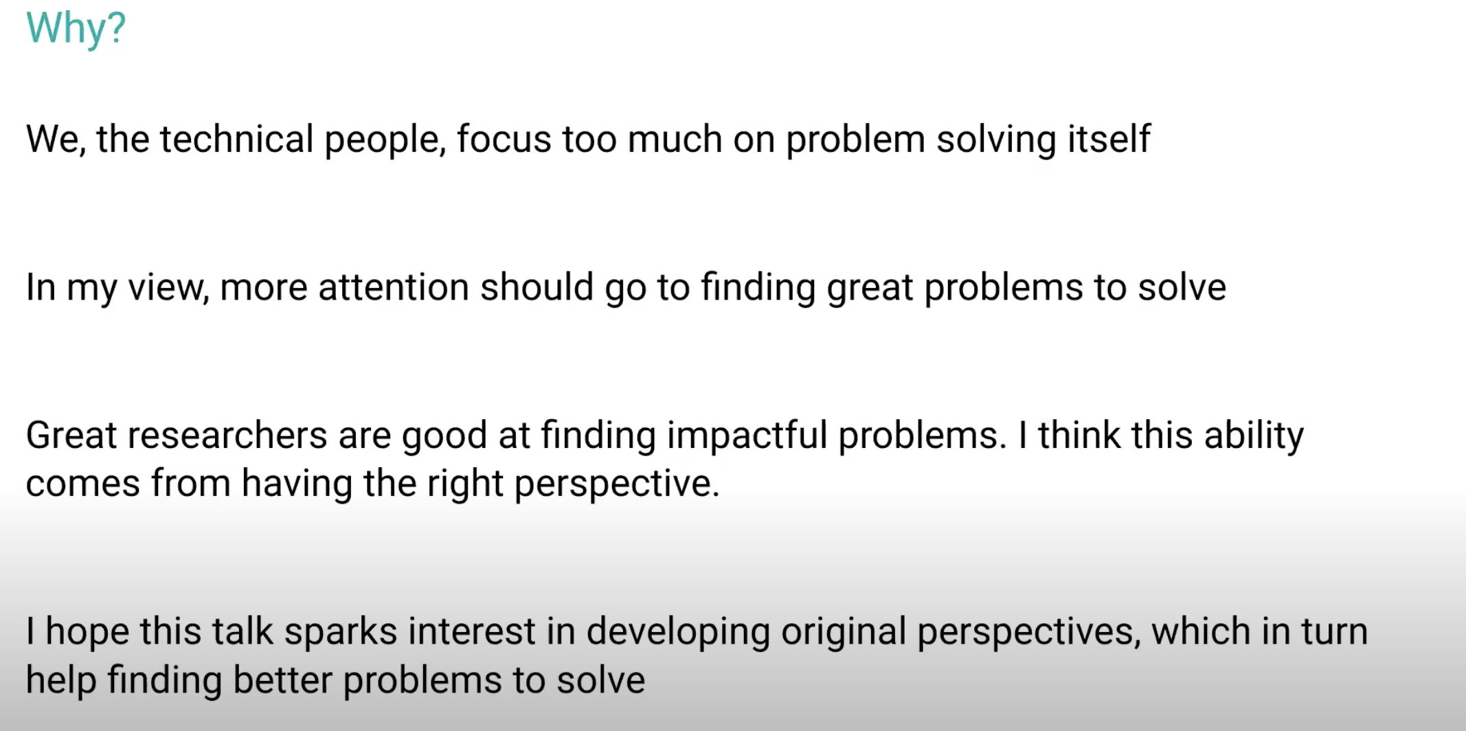 Having the right perspective 어쩌다 OpenAI의 정형원님의 톡들을 요 몇달간 유튜브에서 자주 보게 되었는데기록하고, 기억하고 싶은 말들이 있어서 간단하게 정리해본다출처 ㄱ technicque보다 더 중요한 건 'impactful problems'을 찾는 것.그리고 그건 right perspective에서 옴. (내 생각에도 결국 학위 과정은 어떤 한 분야를 깊고 오랫동안 follow up하면서 이 'perspective'를 기르는 과정인듯) 일기장/Reference 2024.09.20